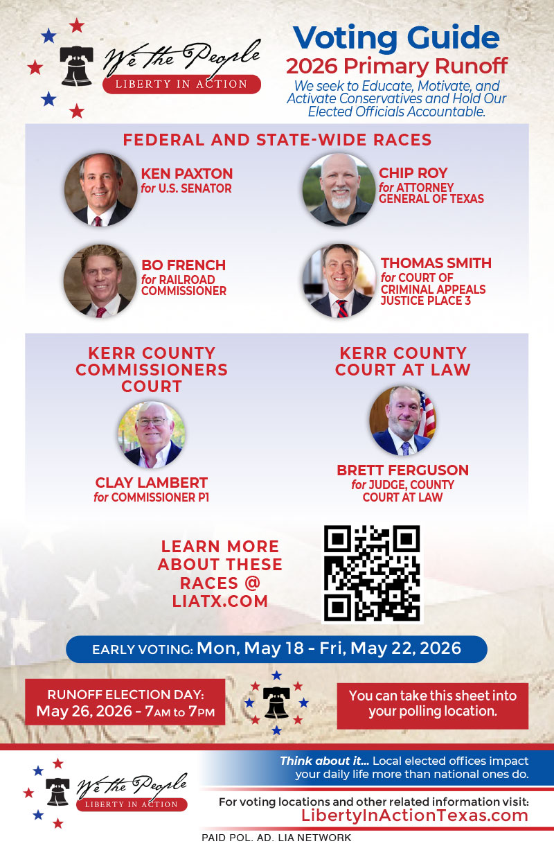 The Candidates Answer... Liberty in Action sent all Kerr County Clerk candidates screening questions for the upcoming primary (March 3, 2026). Those in blue, did not return their answers by the 1/19 deadline. Other candidates submitted their answers and we want to...