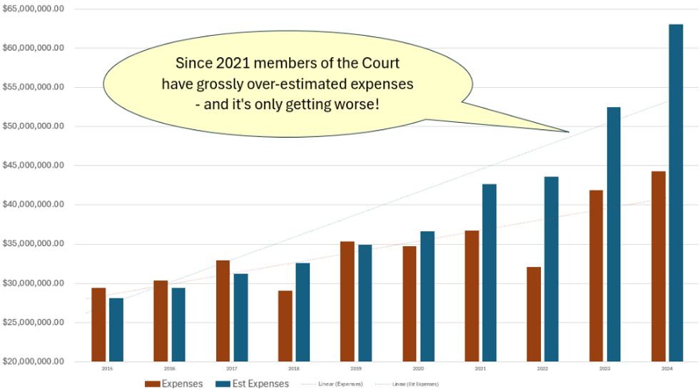 Figure 1: The blue bars represent estimated expenses in the budget, while the red show actual expenses per audited County financials.
